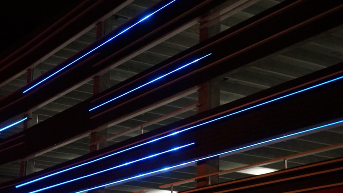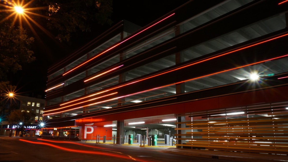 The original intent put forward by Stantec was to create the representation of trailing car lights captured in a long exposure photograph. The exterior of the parkade is marked with striations of linear horizontal aluminum fins in which SACO’s V-Stick system is perfectly integrated.