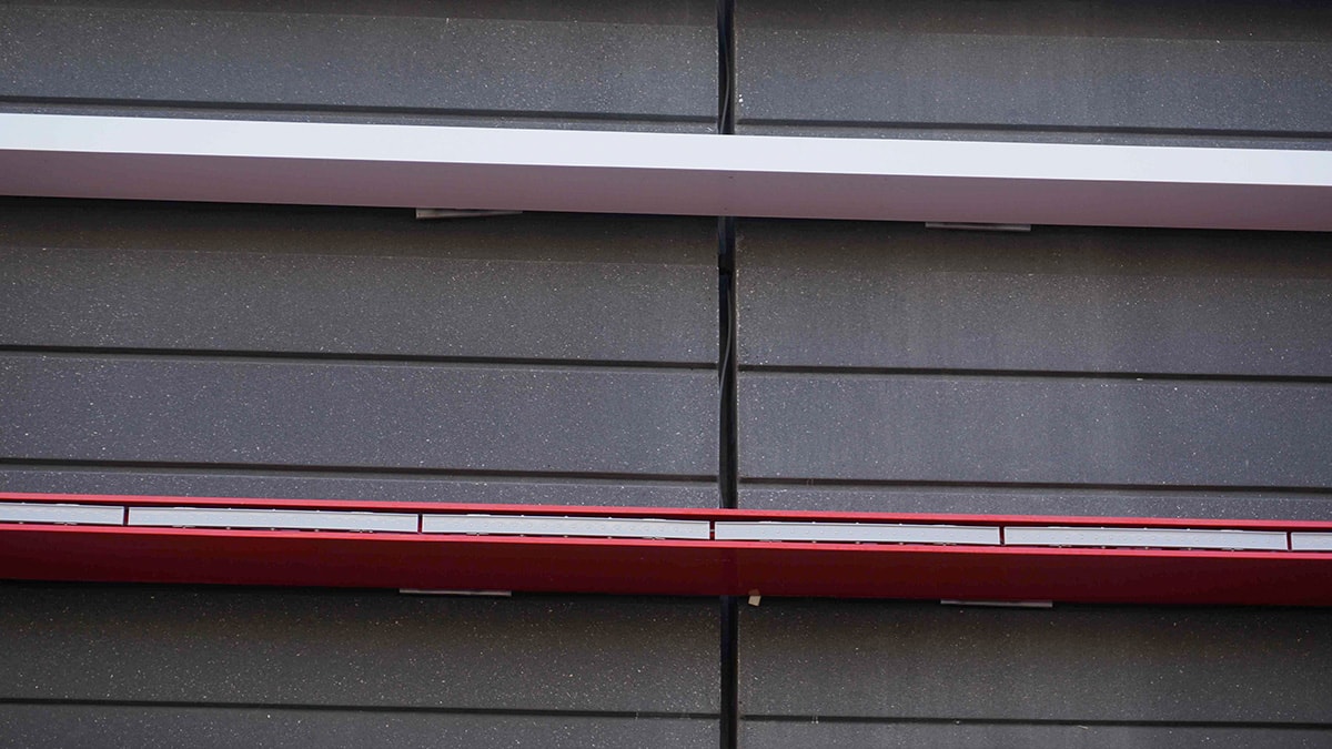 SACO Design Lab pushed the envelope by creating a custom carrier for the V-Stick system which seamlessly matches the building fin material and color. The installation appears to be an extension of the red horizontal fins rather than a simple “add on” component. The entire system was created with ease of service in mind, utilizing a combination of quick connect IP67 connector, IP67 LED Video Lighting fixtures, and quick release brackets.
