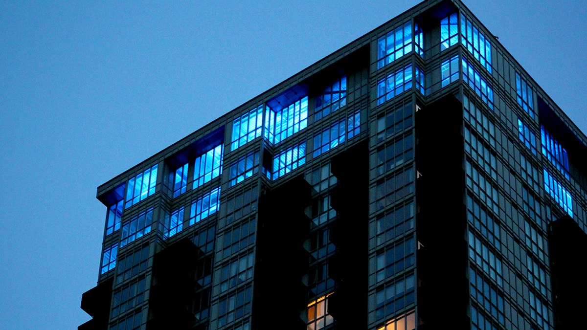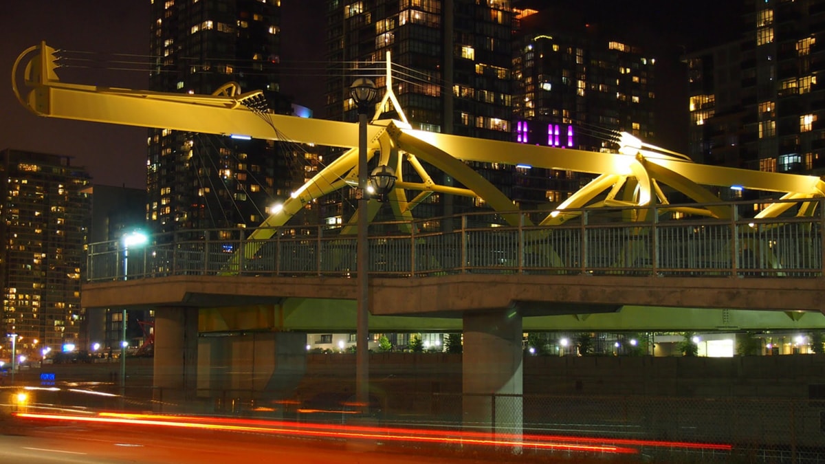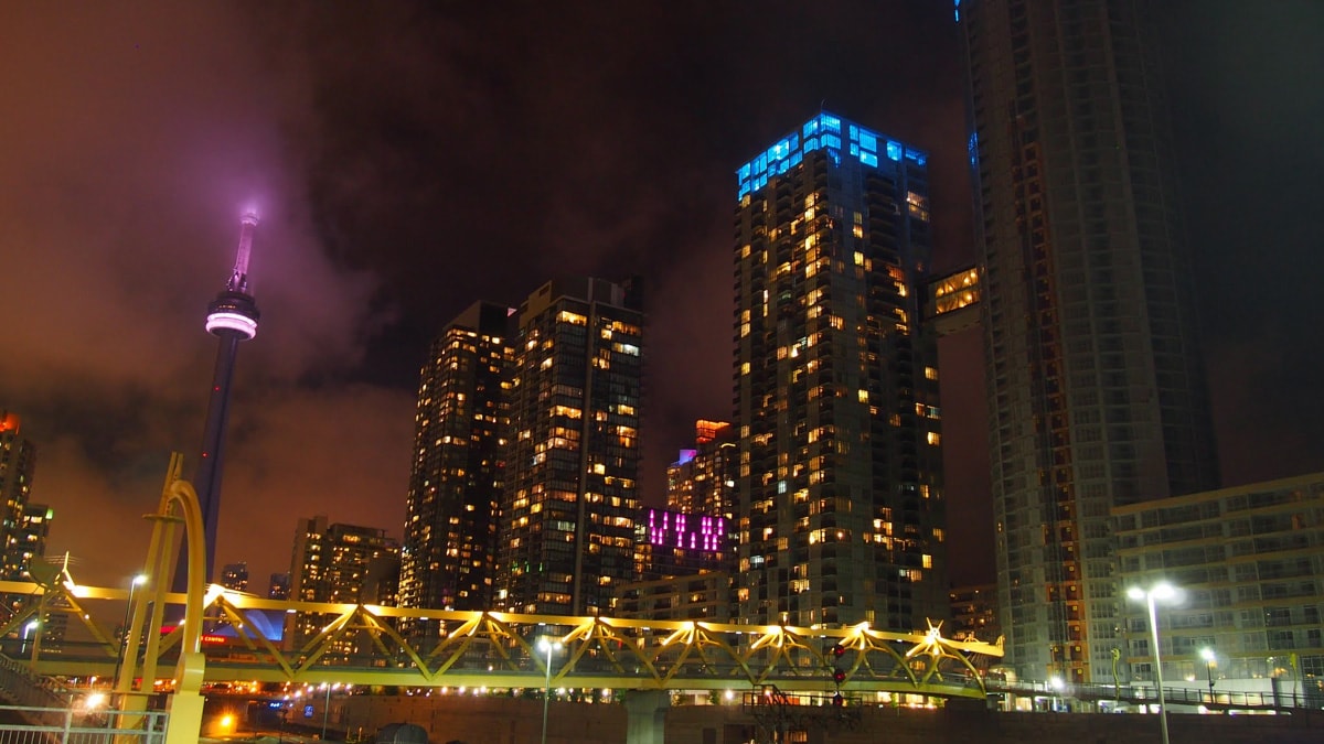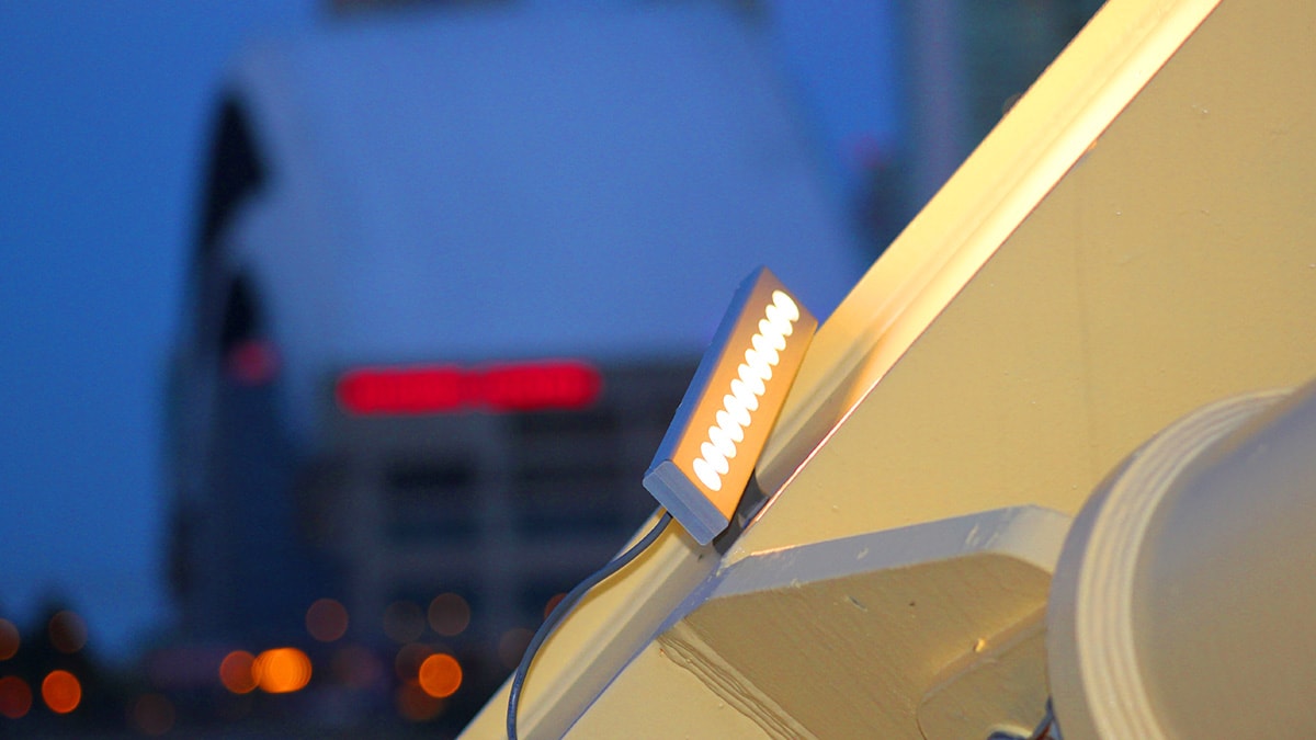 Warm By Night is a public art commission for CityPlace towers south of Front St. on both sides of Spadina Ave. in Toronto. The Concord Adex Development corporation requested an artistic roof-top lighting treatment that would unify and define the towers within the skyline. There was a proposal to illuminate the mechanical levels of each tower with warm-coloured light as a way of emphasizing warmth, welcome and domesticity. The towers were thereby marked as being people’s homes and lent a subtle sense of habitation and animation. SACO illuminated the top section of one of the skyscrapers in blue using the powerful DELTA-2 RGB Video Lighting fixture.