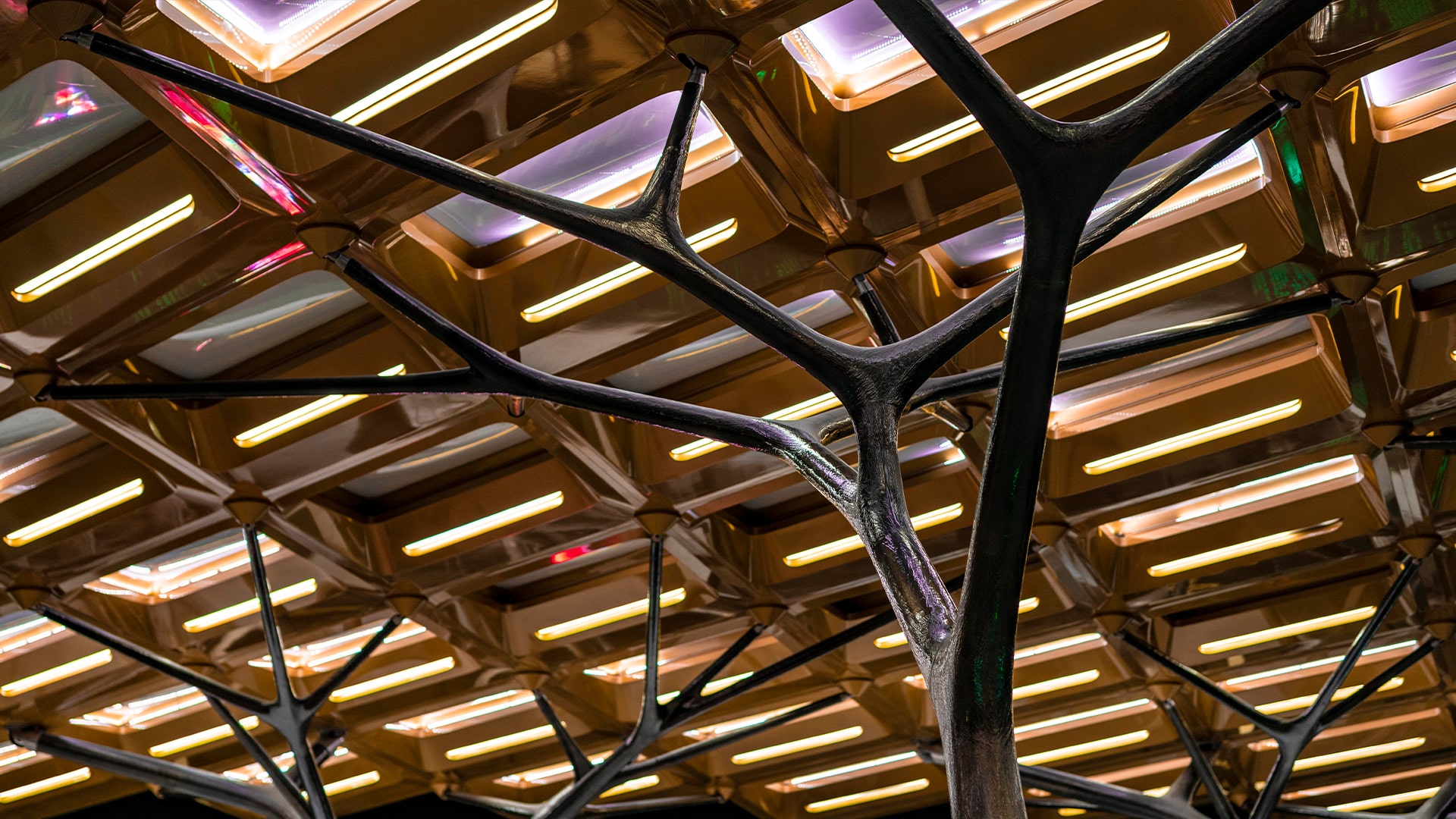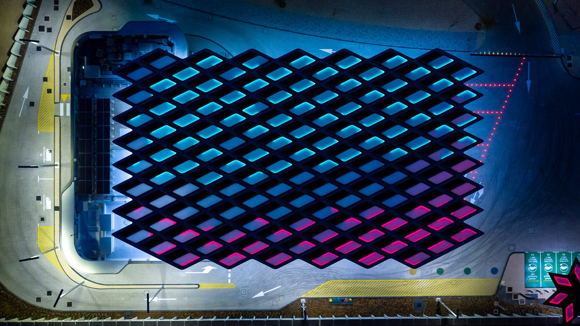 The station is headlined by a uniquely designed canopy, shaped to resemble the exoskeleton of the Ghaf. The canopy encloses a leaf-shaped ethylene tetrafluoroethylene (ETFE) cushion canopy, illuminated with more than 2,506 SACO Video-controlled LED V-Stick-S fixtures, with high efficiency allowing the station up to 60% of energy saving.
