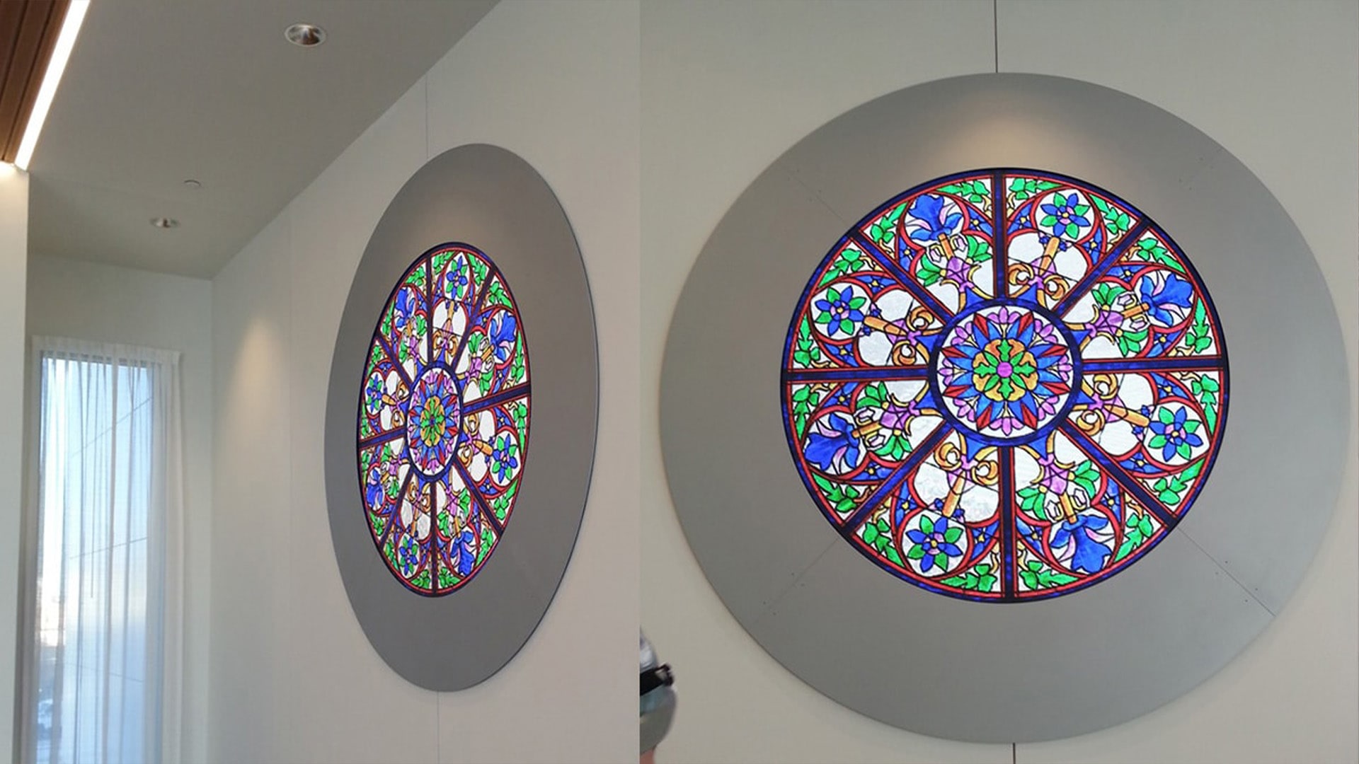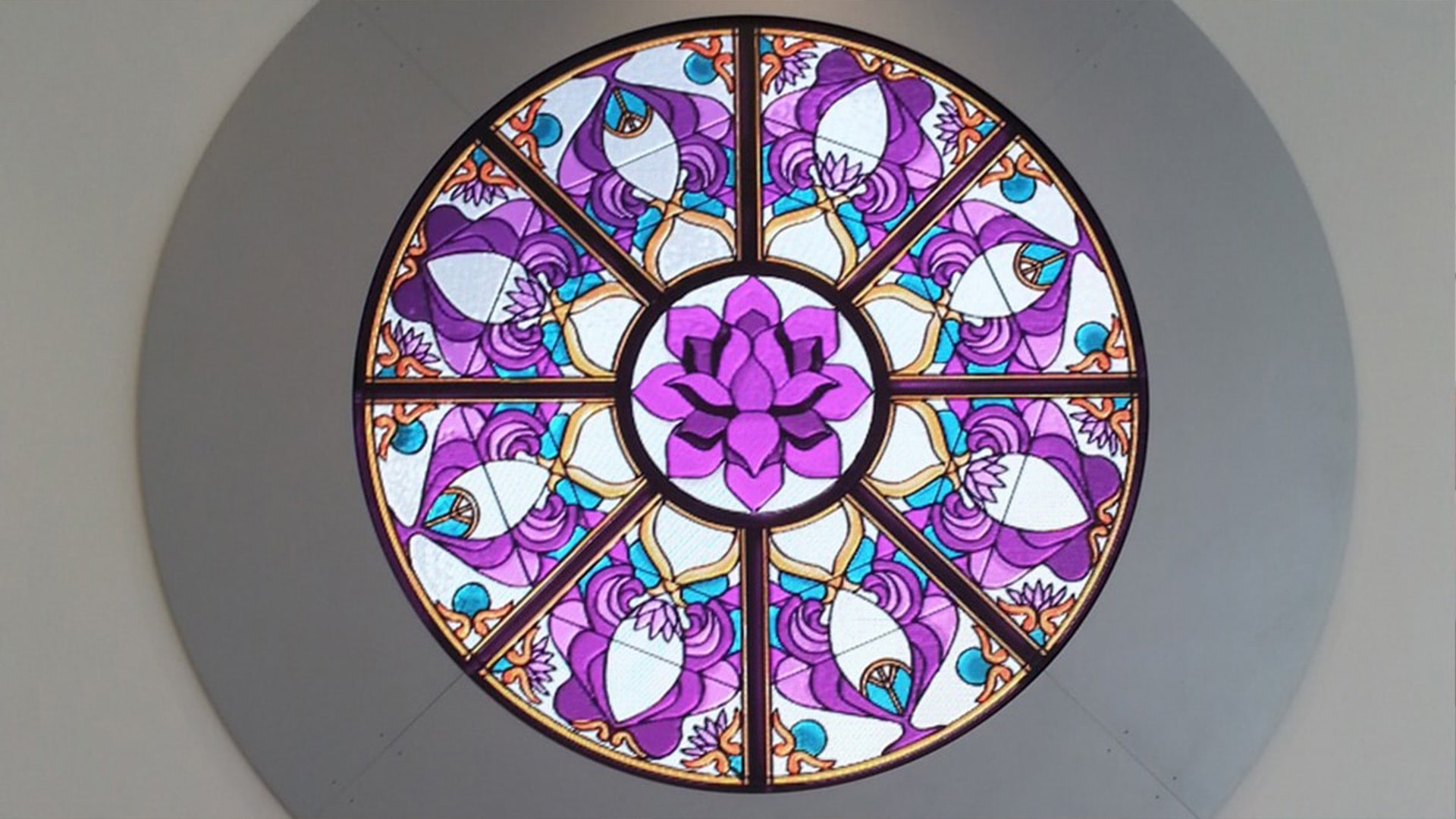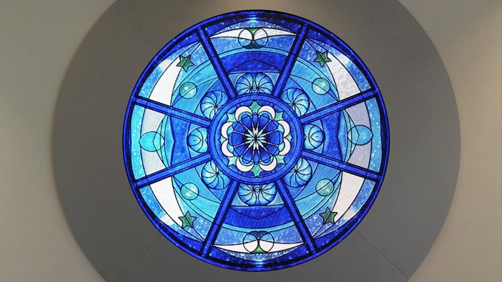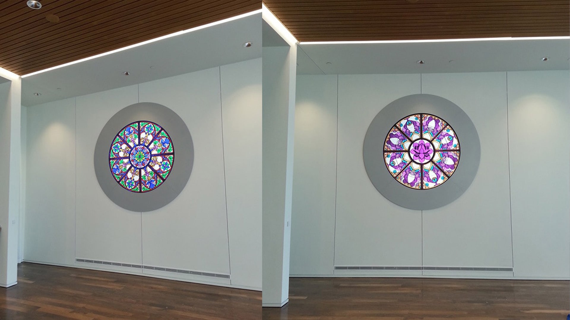 The Rosette uses a 4mm pitch LED tile product that is mounted within a customized circular frame and an architecturally inspired “ferramenta”, the supporting ironwork associated with stained glass panels. The multimedia content changes gradually and almost imperceptibly. Original multimedia content was created to reflect a diverse range of religious and spiritual traditions. Users of the Chapel space can set the Rosette to show imagery appropriate for their activity.