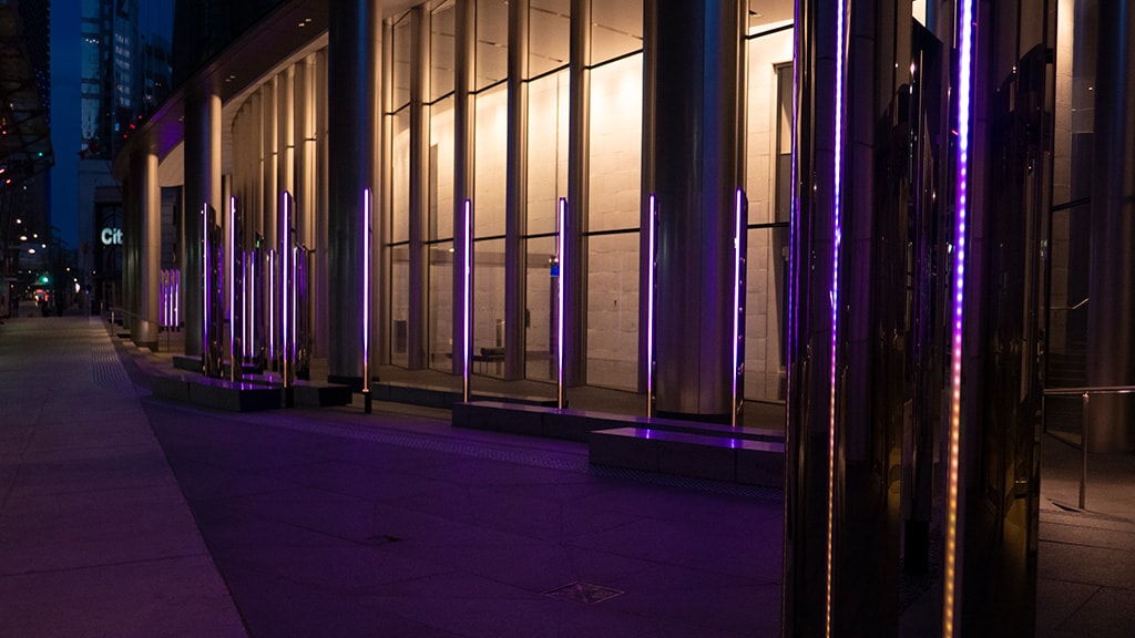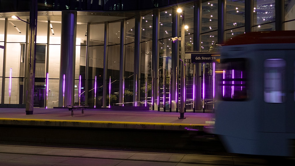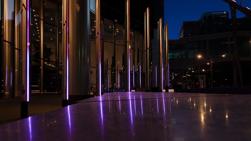 The V-Stick product was carefully selected, not only for its superior brightness and clarity that can easily be seen by day and night, but also for its versatility, durability and ability to withstand the extreme weather conditions associated to Alberta. With the power to connect to live-streaming data, SACO’s video light fixtures enable the lighting designer to broadcast live content, change colors, directional movement, frequency and more. The Occurrence of Light installation uses SACO’s proprietary high-speed V -Stream video communication protocol, which provides the most depth of color.