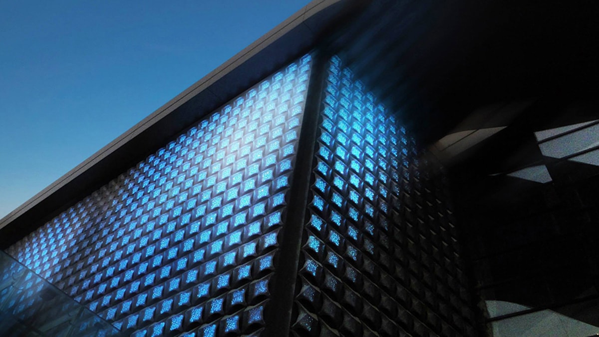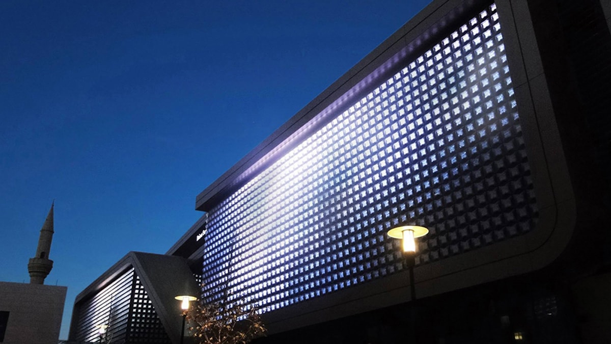 SACO designed a custom-made product to fit the pyramidal shapes that will cover the four parts of the facade on the two sides of the building. Visible both from within the Souk to the shoppers and passer by, and from the road when driving on the Corniche Road, this Media Facade will have a smooth beautiful effect that will fit the innovative architectural concept of the SEC.