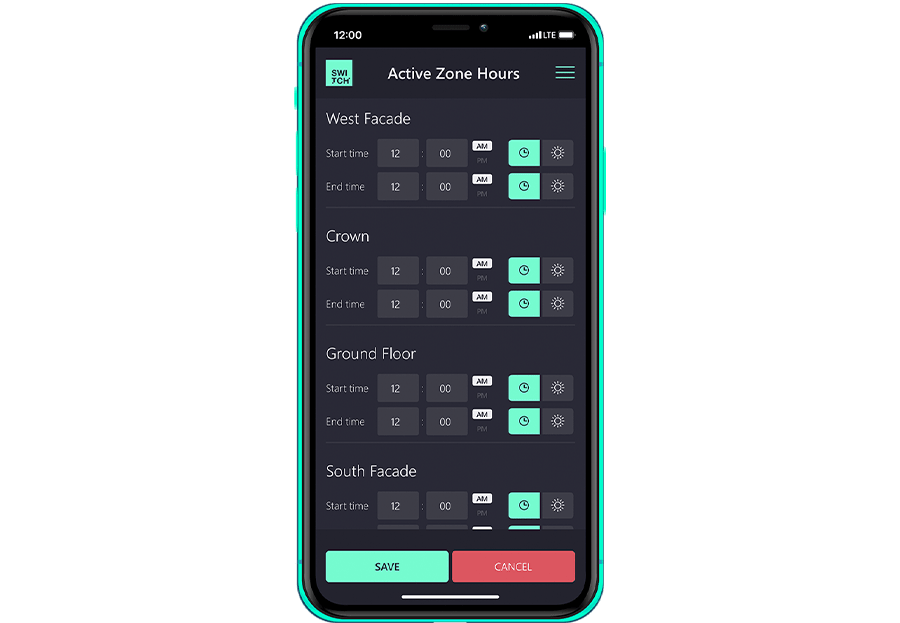 SWITCH is fully integrated with SACO’s line of video-enabled light fixtures. SACO’s video-enabled light fixtures function by converting pixel information from a video feed into color information that can be displayed by the lighting fixtures, effectively treating the fixtures as pixels on a television screen.